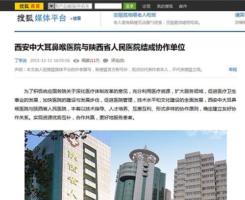 【搜狐网】西安中大耳鼻喉医院与陕西省医院结成协作单位
